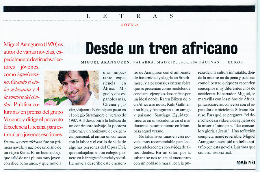 "Los viajes han vuelto con una fuerza insospechada. Y, con ellos, la literatura de viaje. Desde un tren africano es un libro notable por muchas razones. En primer lugar no puede dejar de llamar la atención que el autor tenga 19 años. A esa edad, sólo la gente muy precoz consigue abrirse camino, con algo verosímil, en el mundo, más difícil de lo que se piensa, de la literatura. Miguel Aranguren sale airoso de la aventura (...) En unos tiempos en los que abunda la narrativa hecha por puro afán, se agradece esta inmediatez" (Expansión, 13 de octubre de 1999).