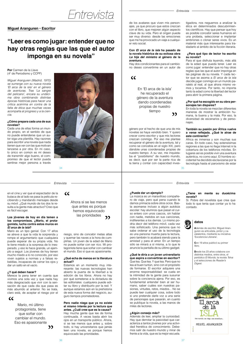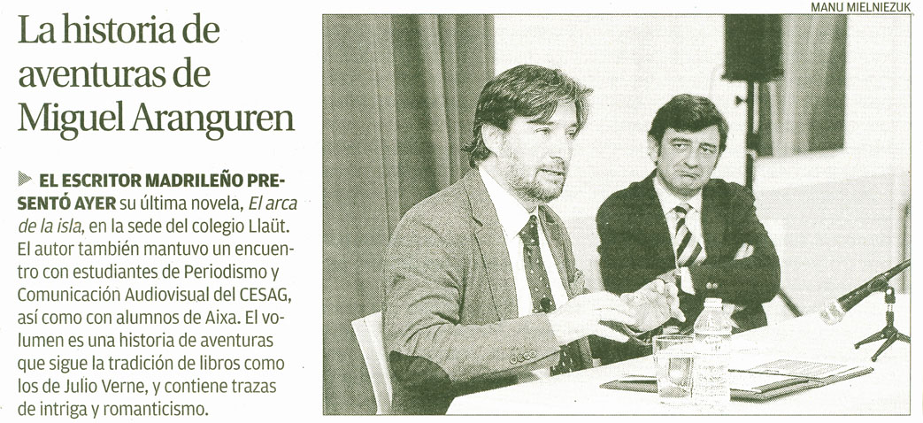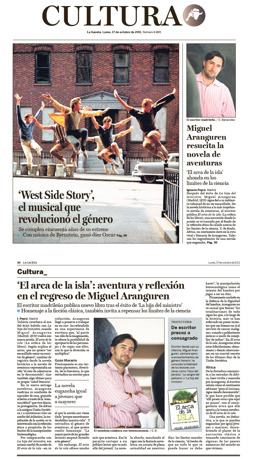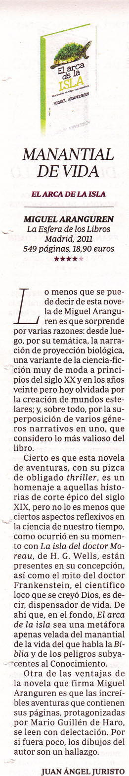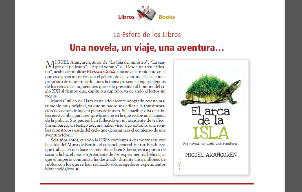 9.<<Tal como decía Francisco Umbral, el valor de un autor se mide por la capacidad que tiene para que cada una de sus obras se adentre por sendas narrativas nuevas. Cuando un amigo me regaló La hija del ministro, me enganchó su detallada trama histórica; después me enterneció la humanidad de los personajes de Aquel verano; y ahora me ha sorprendido la complejidad narrativa de El arca de la isla. En esta novela aparecen varias historias de modo paralelo, las cuales suceden en diferentes continentes y en momentos históricos distintos. El riesgo de escoger un marco narrativo tan amplio está en que no encajen bien las historias, mas no es el caso. El arca de la isla es una aventura trepidante, perfectamente ensamblada, en la que el lector asiste al desmoronamiento de la URSS, a los peligros que viven los cazadores en África y a la resolución de un misterioso crimen; y todo ello acaba confluyendo en una búsqueda sobre la condición humana. Hasta donde he leído, “El arca de la isla” es el texto narrativamente más ambicioso de Miguel Aranguren y representa un cambio de estilo con respecto a anteriores obras>>. Santiago Sevilla (Madrid)