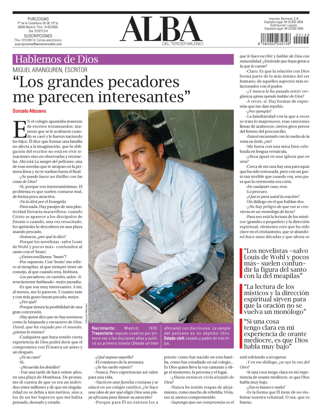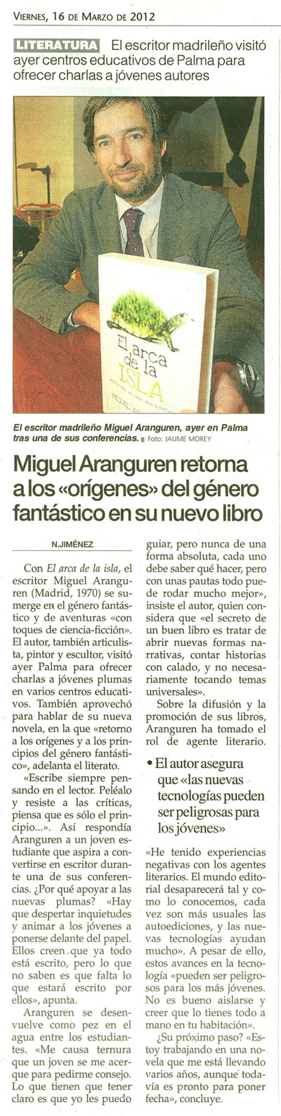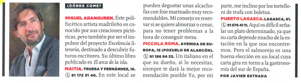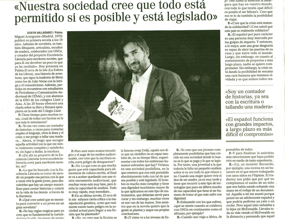 9.<<Tal como decía Francisco Umbral, el valor de un autor se mide por la capacidad que tiene para que cada una de sus obras se adentre por sendas narrativas nuevas. Cuando un amigo me regaló La hija del ministro, me enganchó su detallada trama histórica; después me enterneció la humanidad de los personajes de Aquel verano; y ahora me ha sorprendido la complejidad narrativa de El arca de la isla. En esta novela aparecen varias historias de modo paralelo, las cuales suceden en diferentes continentes y en momentos históricos distintos. El riesgo de escoger un marco narrativo tan amplio está en que no encajen bien las historias, mas no es el caso. El arca de la isla es una aventura trepidante, perfectamente ensamblada, en la que el lector asiste al desmoronamiento de la URSS, a los peligros que viven los cazadores en África y a la resolución de un misterioso crimen; y todo ello acaba confluyendo en una búsqueda sobre la condición humana. Hasta donde he leído, “El arca de la isla” es el texto narrativamente más ambicioso de Miguel Aranguren y representa un cambio de estilo con respecto a anteriores obras>>. Santiago Sevilla (Madrid)