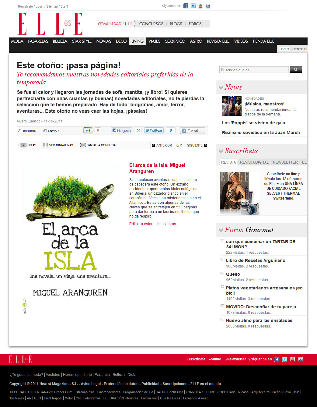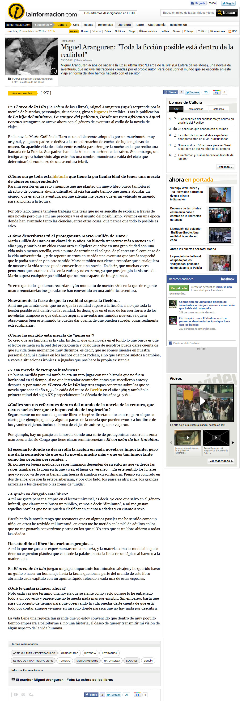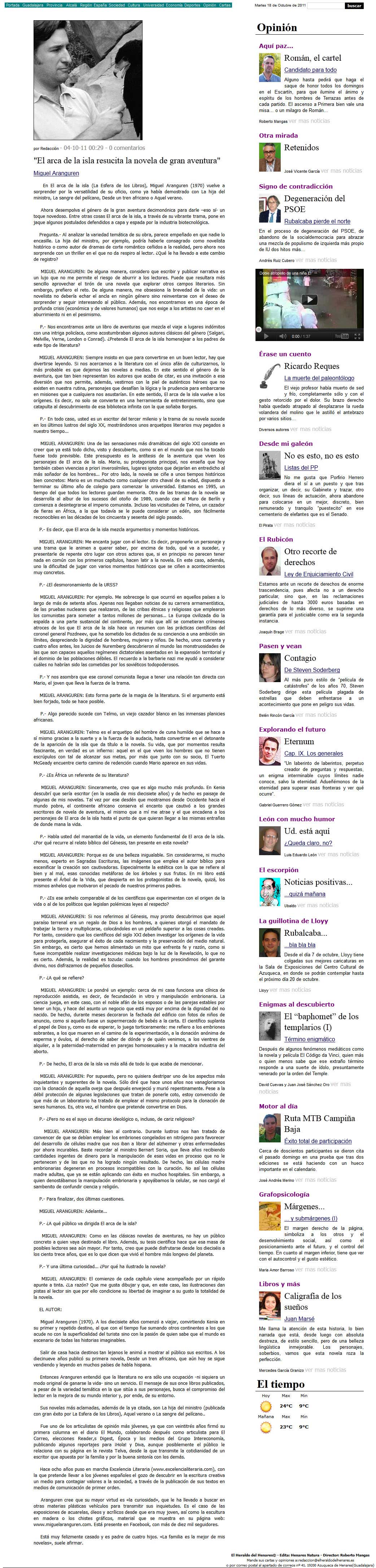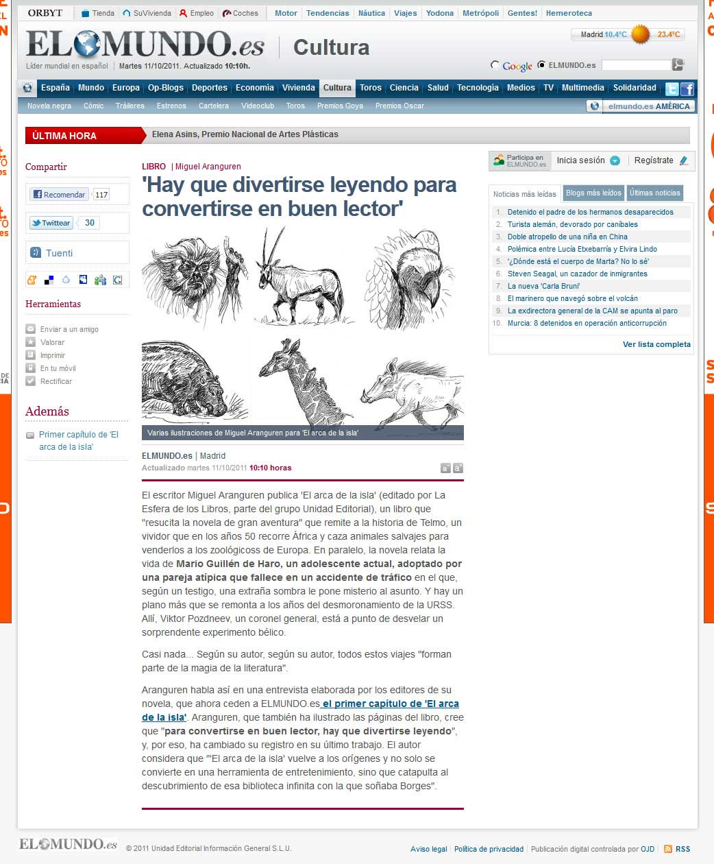 3.<<Anoche terminé “El arca de la isla”. Me ha gustado muchísimo. Hoy me he acordado varias veces de Mario Guillén de Haro, de Cecil, de Amalio Ozores..., y sé que los voy a echar de menos. Son tan reales que, a pesar de que son personajes de una novela, les llegas a coger aprecio por lo que son, lo que hacen y lo que dicen. (…) Digamos que Miguel Aranguren es un buen fotógrafo de la imaginación, de lo que puede ser. Y un buen prestidigitador del lenguaje, porque recupera palabras y expresiones que enriquecen nuestro idioma. ¿Pero todo es perfecto, entonces? ¡Casi! Tengo que confesar que el capítulo donde describe la base en Siberia, en la URSS, me parecía sacado de una película de James Bond. Parecía "Goldeneye". Y me quedé un poco patidifusa, no me parecía el estilo de Aranguren, hasta que vi que era como un guiño, porque es ese personaje que al principio parece plano, sacado de cualquier película o novela de esa época, el que va cogiendo consistencia y dinamismo, y se vuelve aterrador. Animales que hablan, el Árbol de la Vida... Si no fuera porque es una novela, diría que casi me lo he creído>>. Marta (Madrid)