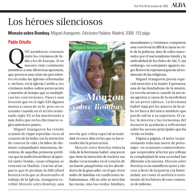 "Entre tanto emperifollado y vacuo turismo solidario de moda, de vez en cuando se encuentra uno con novelas como ésta, en la que la práctica de la solidaridad se plantea no desde el rastrero saneamiento de la conciencia sino desde la decidida búsqueda de la solidaridad humana. La narración está contenida en el Bombay de lo fastuoso y la lepra" (Calibán)