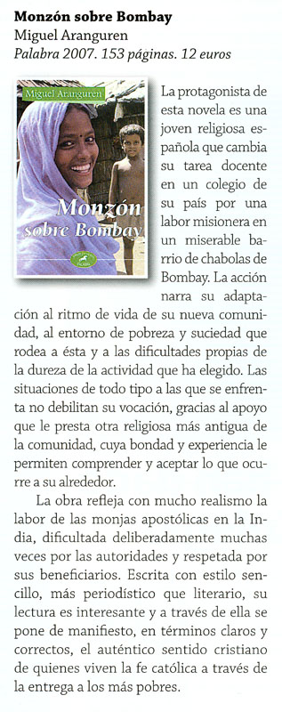 El calor, la pobreza y la lluvia de los monzones harán reflexionar a la joven religiosa sobre los contrastes entre el mundo del que viene y la pobreza en la que se ahoga Bombay. Toda una suerte de personajes sorprenderán al lector, ya que Aranguren ha conseguido convertir esta novela coral en un manifiesto a favor de la justicia y la solidaridad entre los hombres